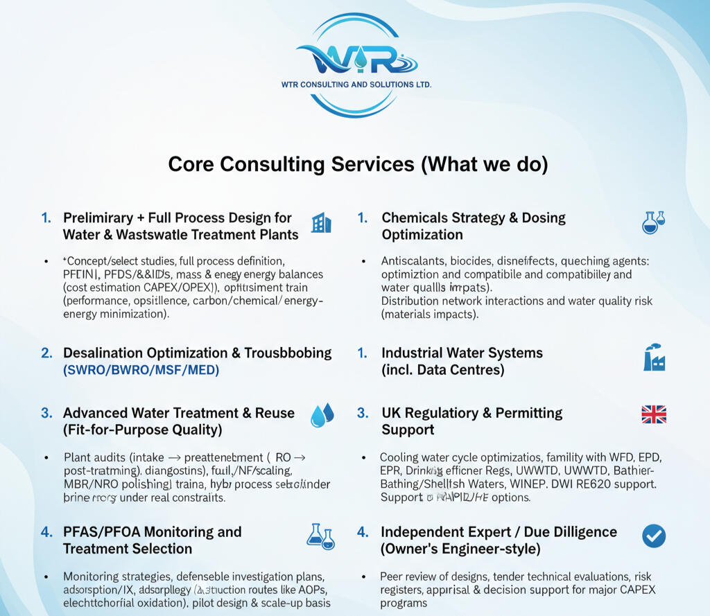 Regulatory, water quality, emerging pollutants, water and wastewater treatment, and market-entry advisory for the global water sector.We help utilities, EPCs, OEMs, and investors accelerate approvals, de-risk delivery, and win opportunities across the UK/EU and the GCC (Saudi Arabia, Bahrain, Qatar).